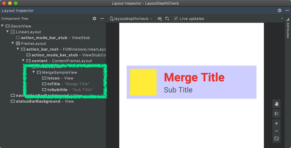 MergeSampleView는 기존 방법과는 다르게 1-depth가 적은 결과를 얻었다. Layout Inspector의 Rotate View를 통해서도 깊이를 확인할 수 있다.