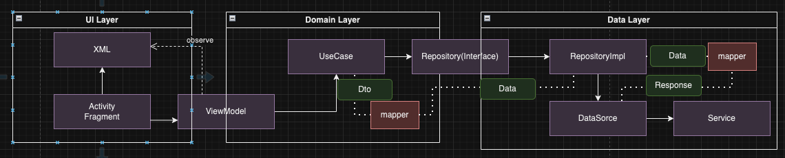 추가적으로 비지니스 로직은 Damain 레이어을 추가하여 Domain 레이어가 맡게 한다면 ViewModel은 Domain 레이어와 연결하는 연결고리가 되어 더욱 커플링을 끊어내게 된다.