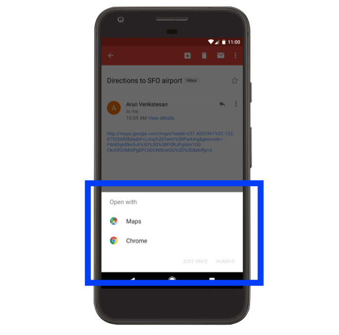 예를 들어 아래의 그림1은 사용자가 지도 링크를 클릭한 후 지도앱 또는 크롬에서 링크를 열 것인지 묻는 disambiguation dialog를 보여준다.