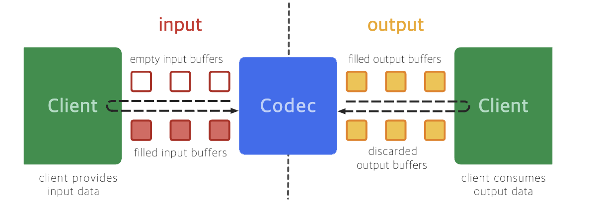 간단하게 설명하자면, MediaCodec은 입력 데이터를 받아서 출력 데이터를 생성하는 역할을 한다. 이 과정은 비동기적으로 이루어지며, 입력 및 출력 버퍼 세트를 사용한다. 빈 입력 버퍼를 요청(또는 받아서) 데이터로 채운 후, 이를 코덱에 전달해서 처리하게 한다. 코덱은 이 데이터를 소비하고, 이를 빈 출력 버퍼 중 하나로 변환한다. 마지막으로, 채워진 출력 버퍼를 요청(또는 받아서) 내용을 소비하고, 이를 다시 코덱에 반환한다.