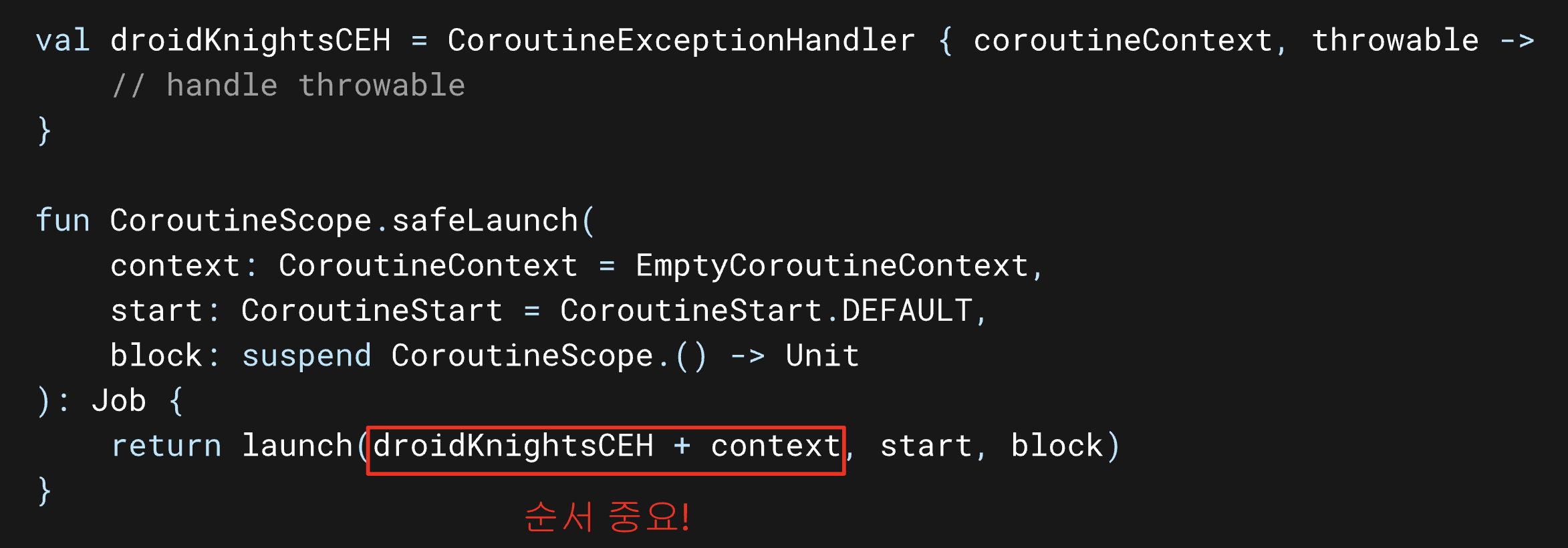 아래 함수는 CoroutineExceptionHandler가 정상적으로 적용이 되었으면 통과하고 아닐 시 Exception을 반환하는 함수이다.