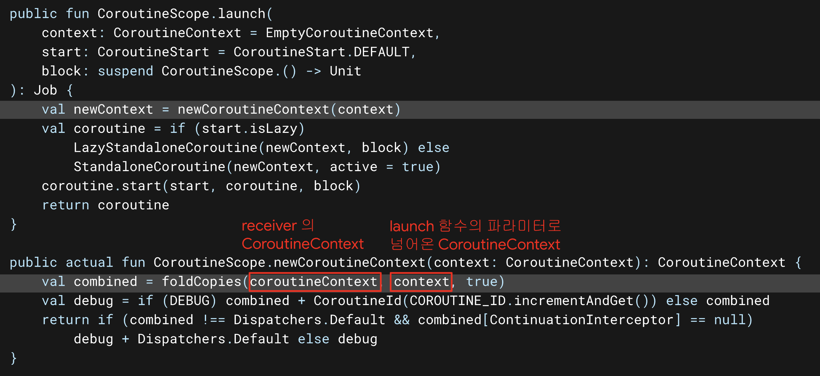 CoroutineScope.launch이 실행이 되면 newCoroutineContext()함수를 통해서 context를 복사를 해준다.