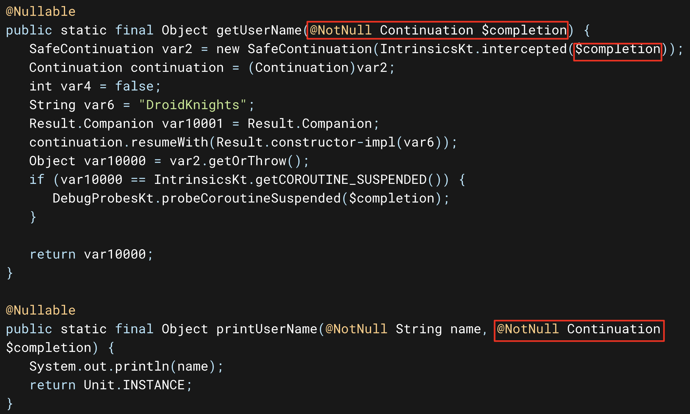suspend Function으로 선언된 함수를 Decompile 해보면, 함수의 마지막 파라미터로 Continuation이 추가되어 있다.