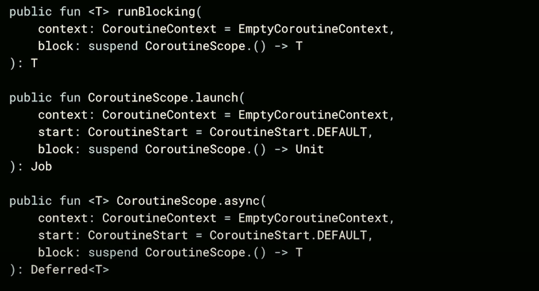 또 이와 유사하게 runBlocking이 정의되어 있고 CoroutineScope.launch, CoroutineScope.async는 다음과 같다.