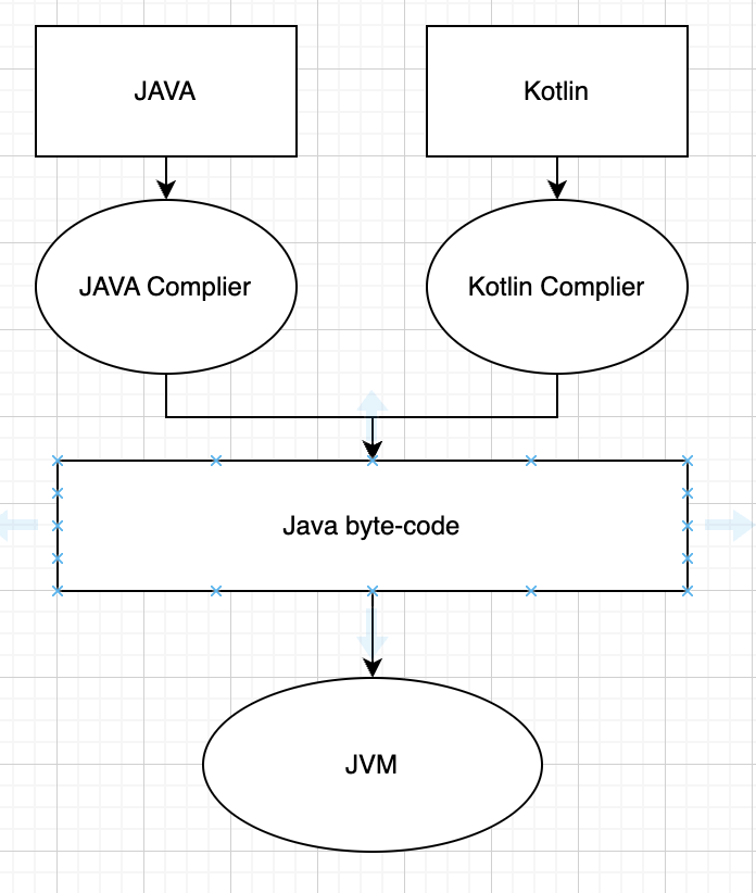자바(확장자 : '.java')와 코틀린(확장자 : '.kt')으로 구성된 파일이 있을때 각각의 javac 와 kotlinc에 의해서 자바 바이트 코드로 컴파일 된다. 이때의 확장자는 '.class' 로 변한다. 이 자바 바이트 코드(확장자 '.class') 는 JVM의 JIT컴파일러에 의해서 기계가 이해 할 수 있는 언어로 변경된다. 이후 해독된 기계언어를 메모리에 할당 후, cpu에 의해 실행한다.