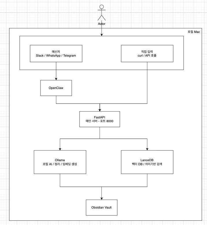 입력 경로는 두 가지다. 메신저(Slack, WhatsApp 등)로 보내거나, 직접 API를 호출하거나. 어느 쪽이든 FastAPI가 받아서 Ollama로 정리하고 LanceDB에 임베딩한 뒤 Obsidian에 저장하는 흐름은 동일하다.