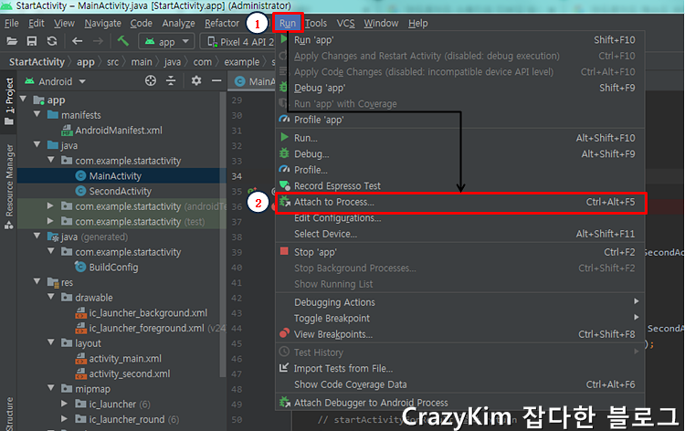 2. "Attach to Process..."을 선택하여 디버깅모드로 전환합니다