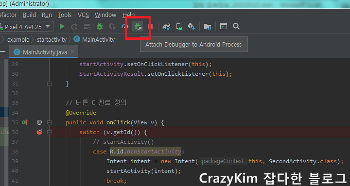 안드로이드 스튜디오에서는 도중에 디버깅모드로 전환하여 실행이 가능합니다