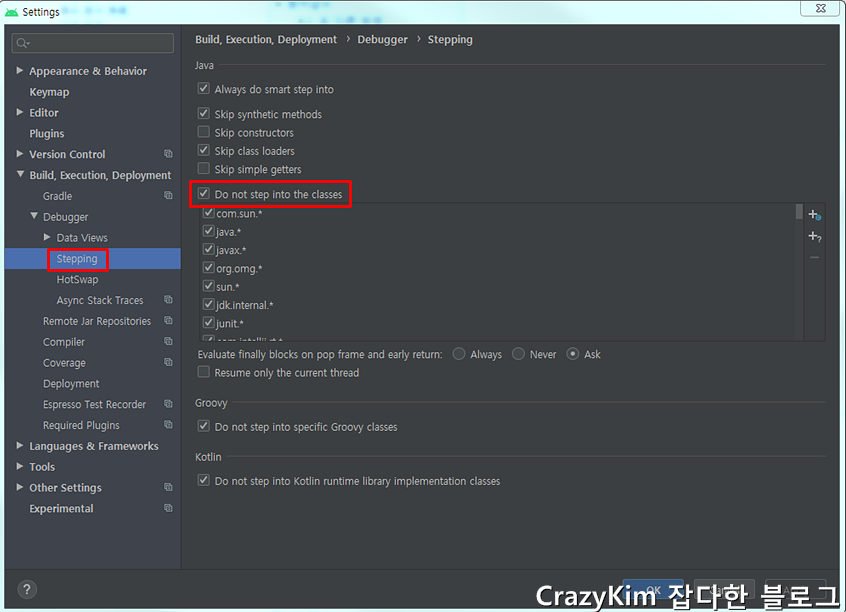 4. Force Step Into : Settings의 "Debugger"옵션의 "Stepping"에 들어가면 "Do not step into the classes" 항목이 있습니다