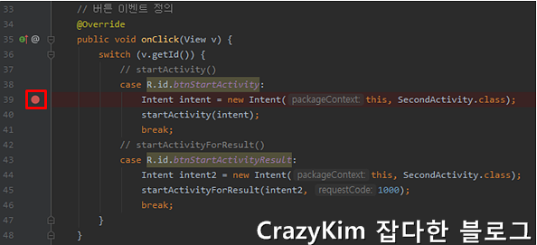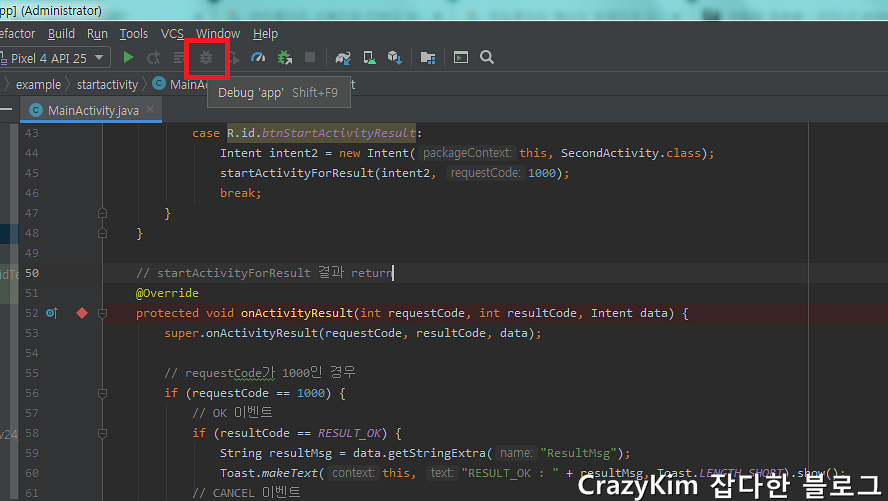 안드로이드 스튜디오에서는 도중에 디버깅모드로 전환하여 실행이 가능합니다