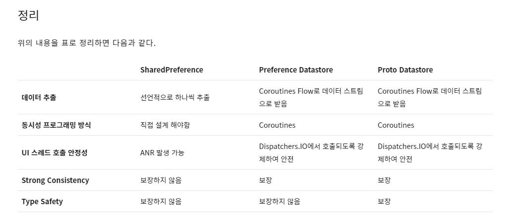 SharedPreferences는 비동기 작업을 제대로 해주지 않으면 ANR을 발생시킬수 있으며, 오류가 생길 시 확인이 불가능했으며, 런타임에 예외가 생기면 런타임에러가 발생해 잘못 사용하면 앱이 강제 종료 될 수 도 있다고 한다. 또한 Strong consistency가 보장되는 api가 없어 다중 스레드 환경에서 다른 결과값이 생길 수 있었다. 이러한 한계가 있어 다양한 처리를 해주어야 했다.