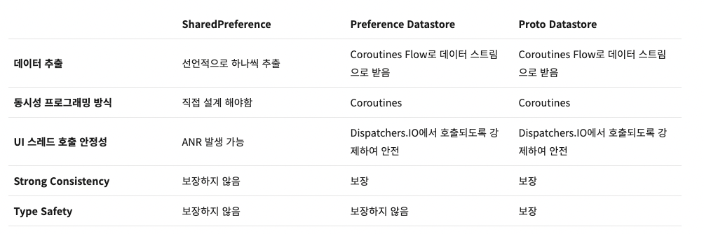 - 기존 UI 스레드에서 호출되어 ANR을 발생시킬 수 있었던 SharedPreferences와 다르다.